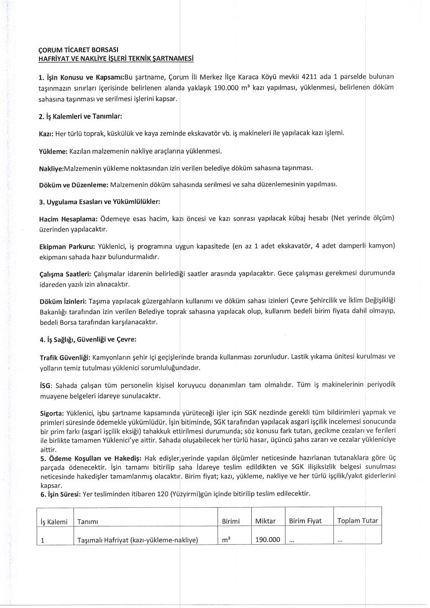 ÇORUM TİCARET BORSASI HAFRİYAT VE NAKLİYE İŞLERİ TEKNİK ŞARTNAMESİ